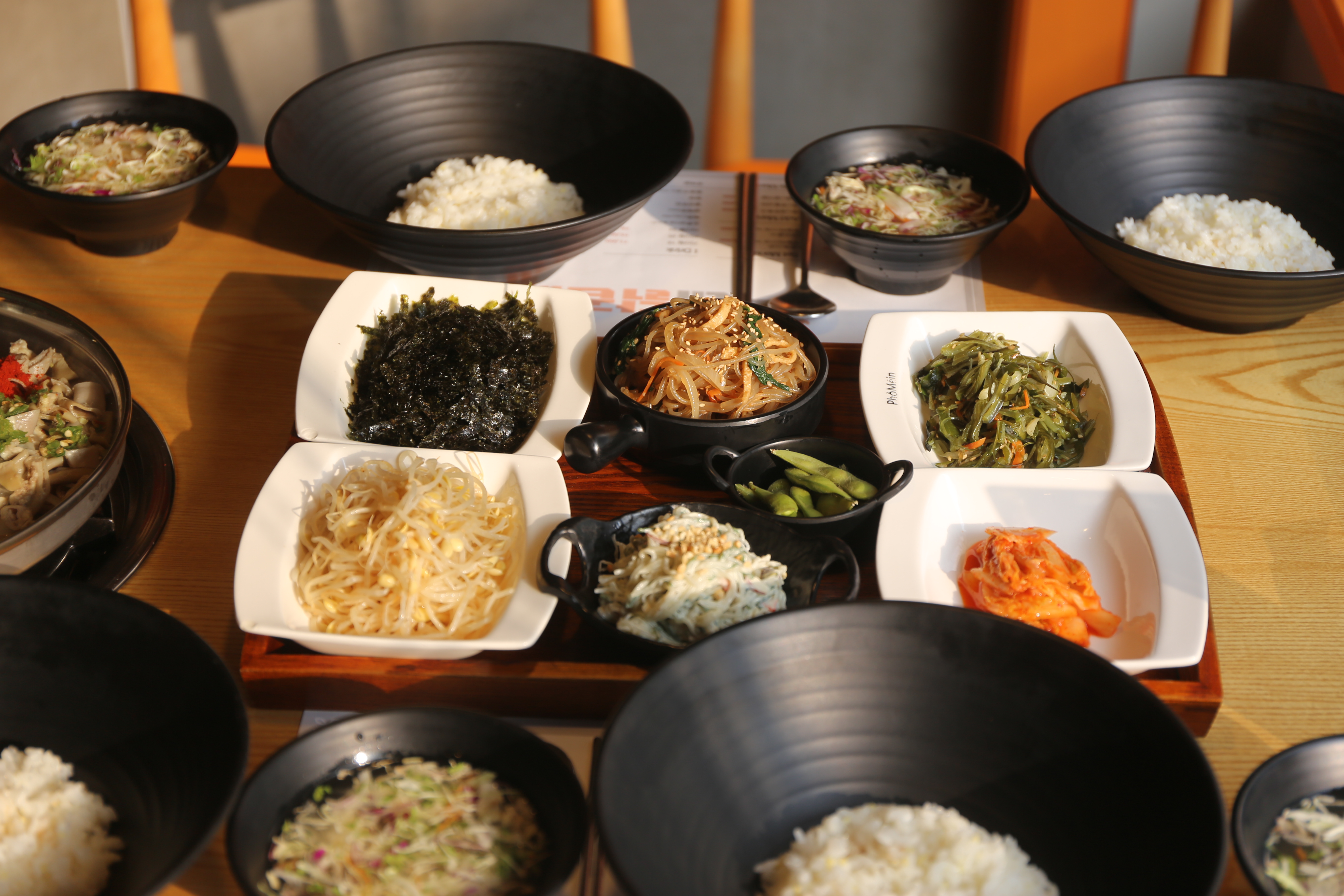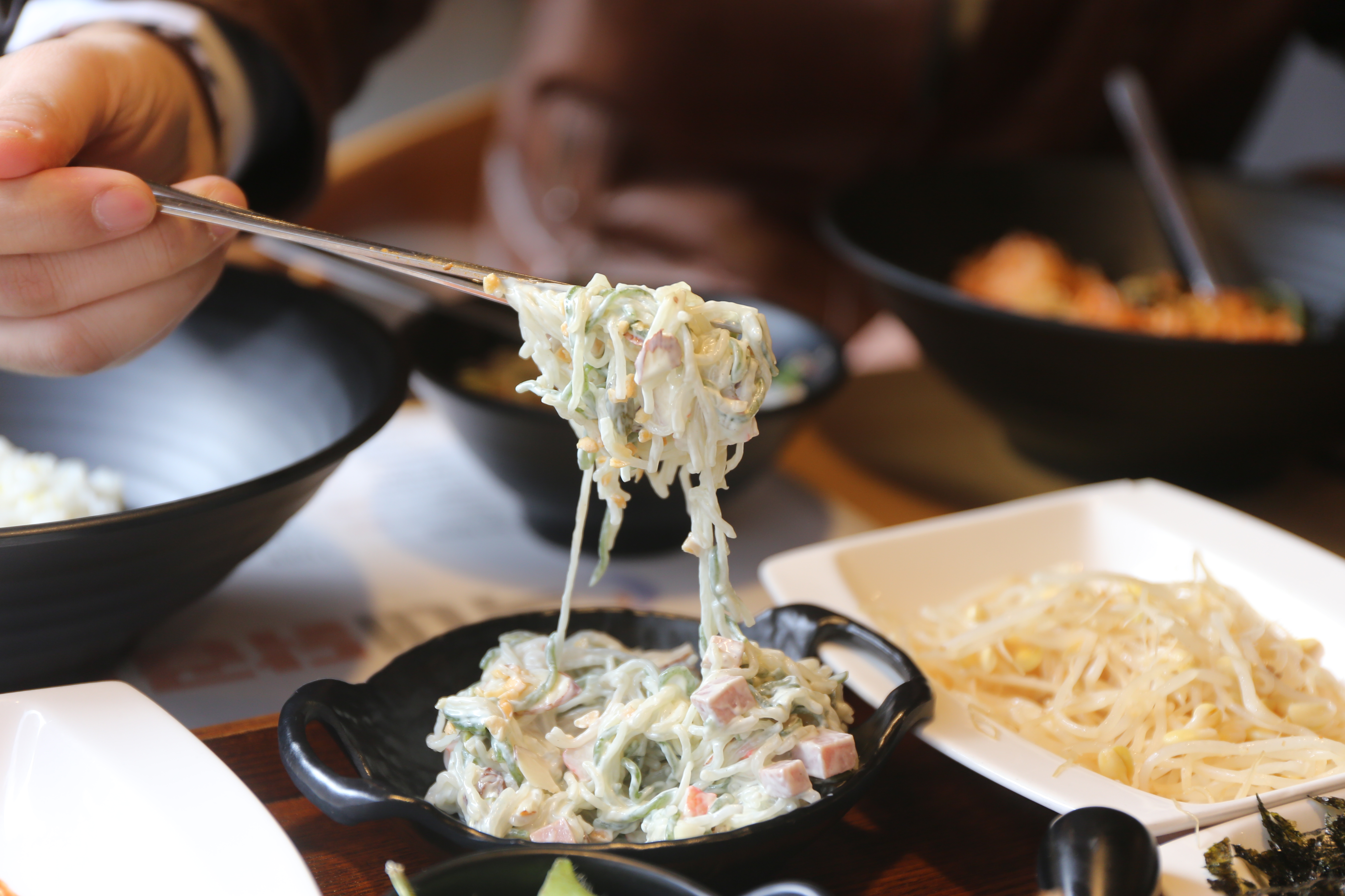 기본 반찬으로 나온 콩나물, 김을 넣고 함께 비벼서 먹으면 그야말로 꿀맛이었습니다. 잡채랑 미역줄기, 김치, 샐러드, 완두콩이 정갈하게