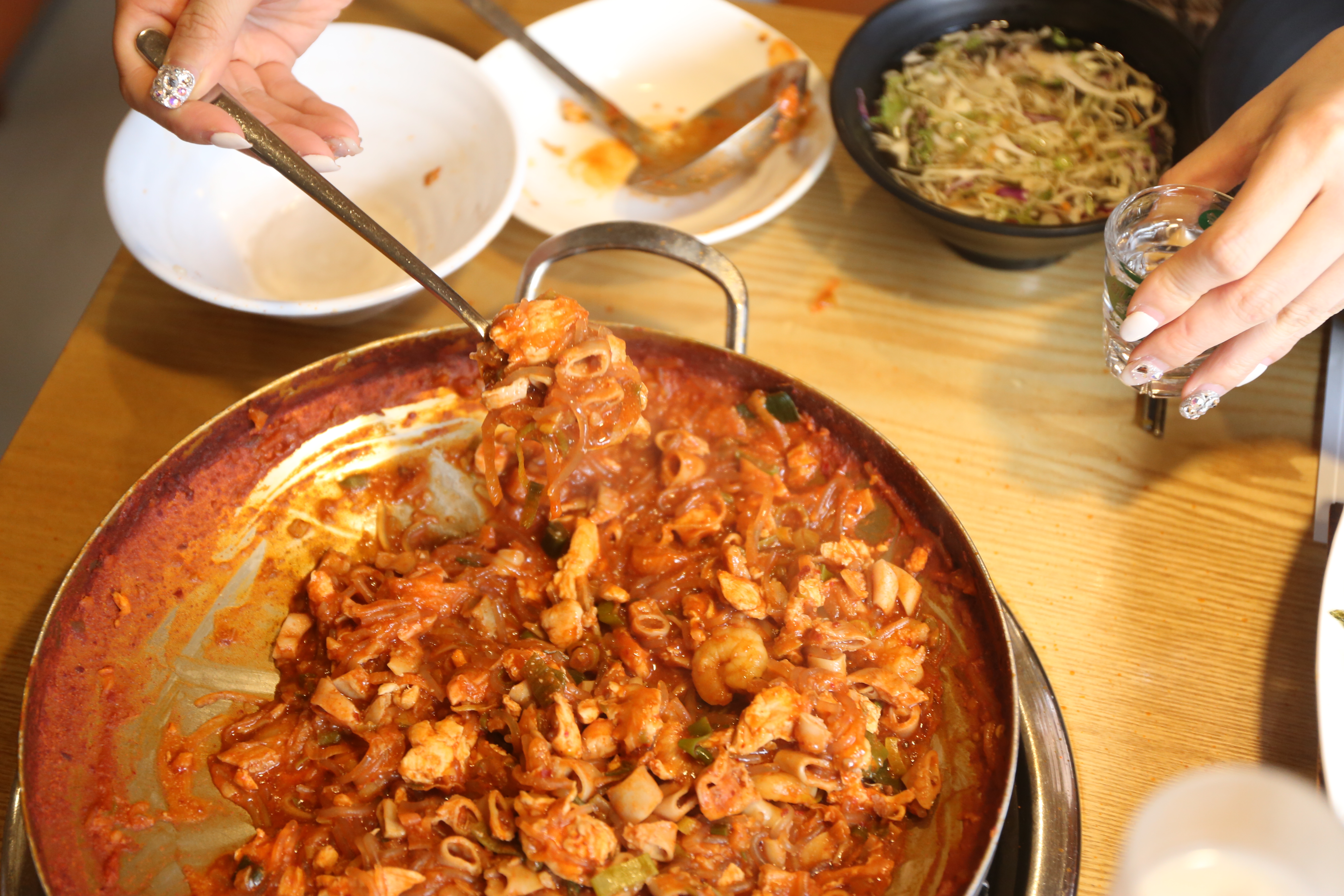 맛있게 매운 양념이 듬뿍 들어가서 보글보글 끓여진 낙곱새를 먹다보니 다들 수다 떠는 것도 잊고 그릇에만 집중했어요.