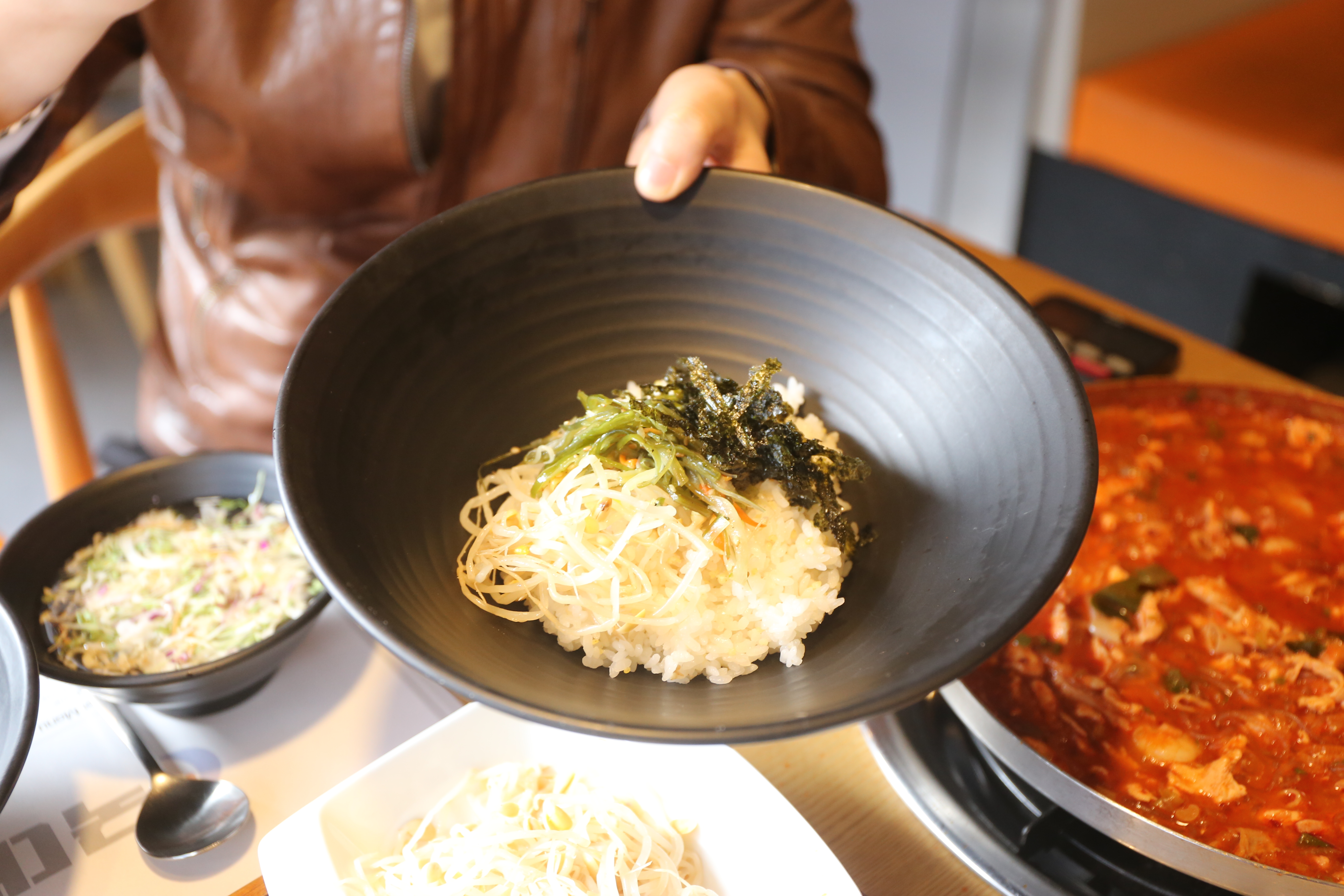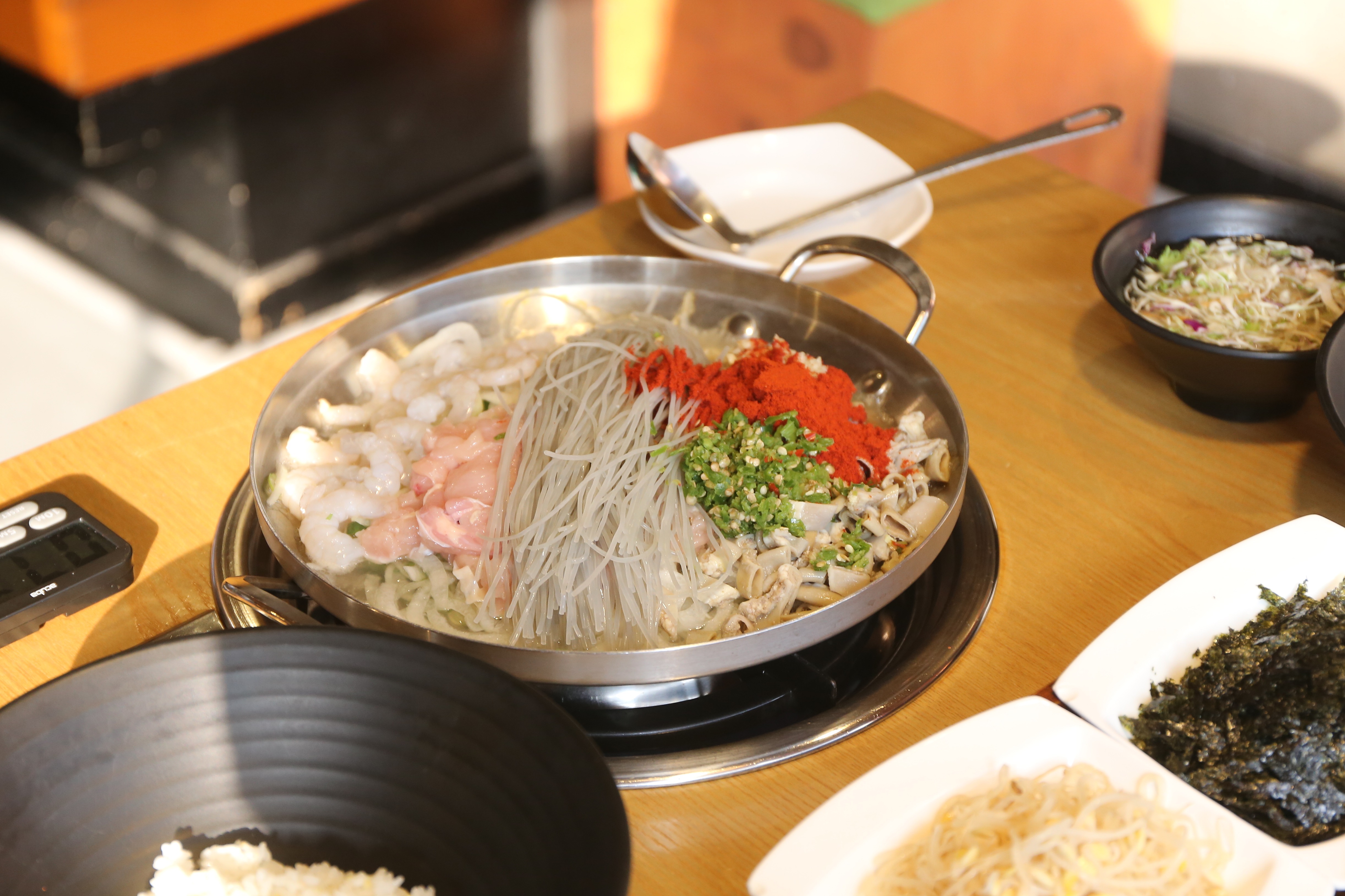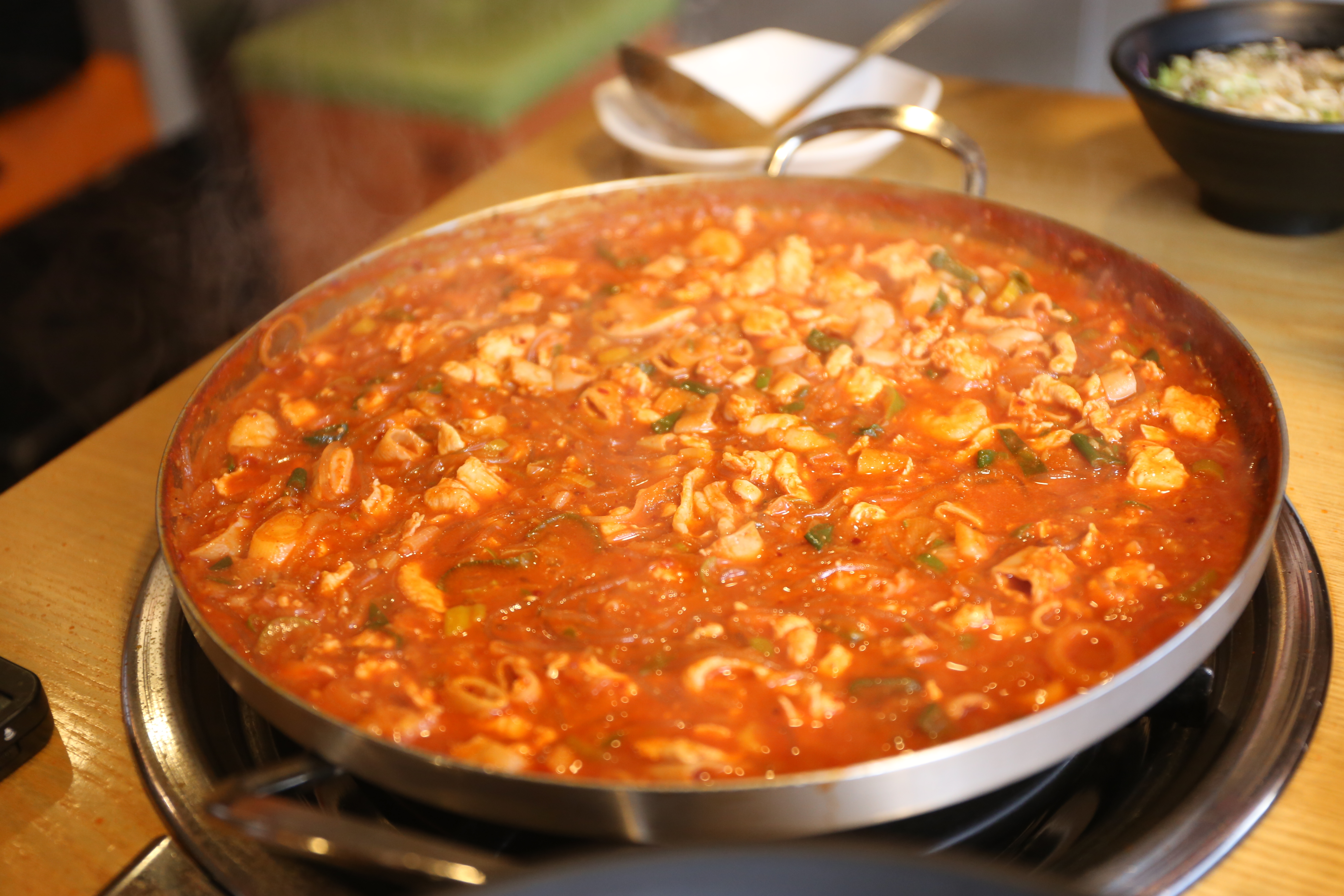 특히나 눈길을 끌었던 비쥬얼은 바로 넓다란 냄비에 담겨진 채로 보글보글 끓여서 먹는 닭곱새였어요. 푸짐하게 들어찬 속 재료들을 보니